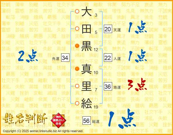 大(3画)田(5画)黒(12画) 真(10画)里(7画)絵(19画)