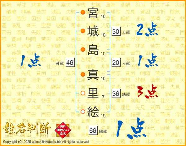 宮(10画)城(10画)島(10画) 真(10画)里(7画)絵(19画)