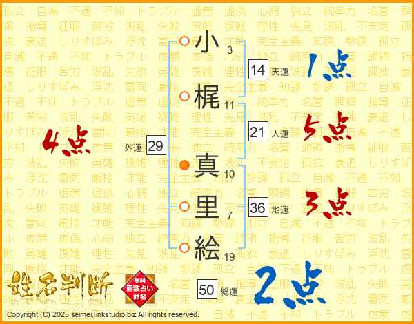 小(3画)梶(11画) 真(10画)里(7画)絵(19画)
