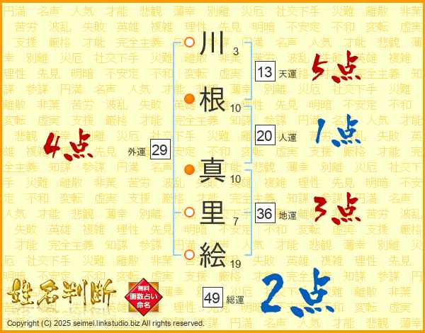 川(3画)根(10画) 真(10画)里(7画)絵(19画)