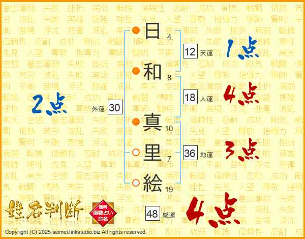 日(4画)和(8画) 真(10画)里(7画)絵(19画)