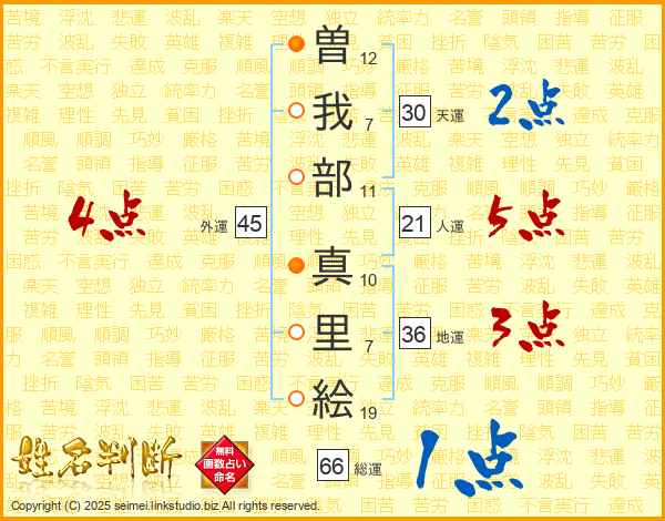 曽(12画)我(7画)部(11画) 真(10画)里(7画)絵(19画)