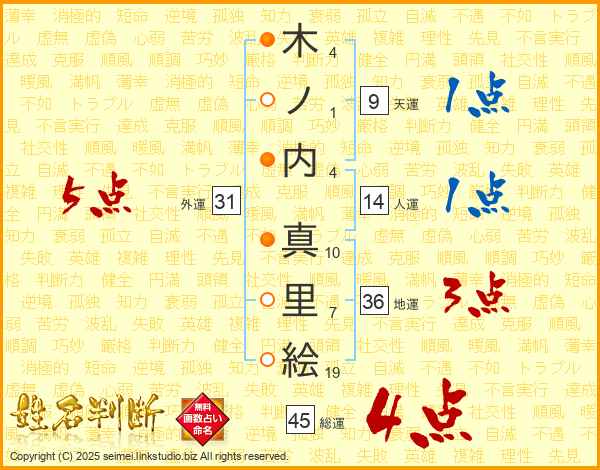 木(4画)ノ(1画)内(4画) 真(10画)里(7画)絵(19画)