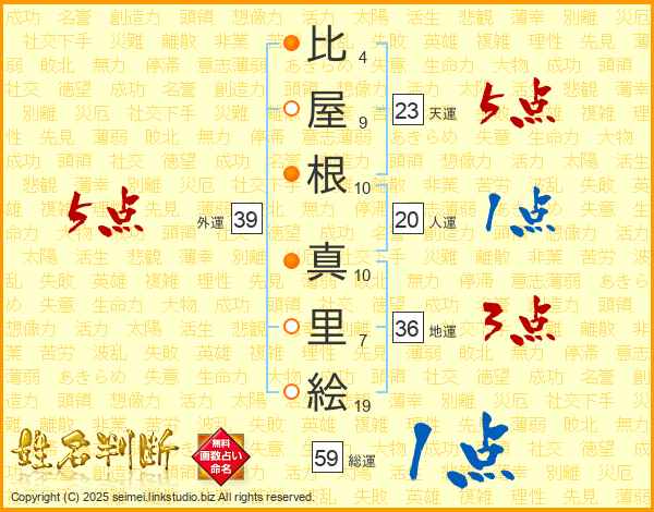 比(4画)屋(9画)根(10画) 真(10画)里(7画)絵(19画)