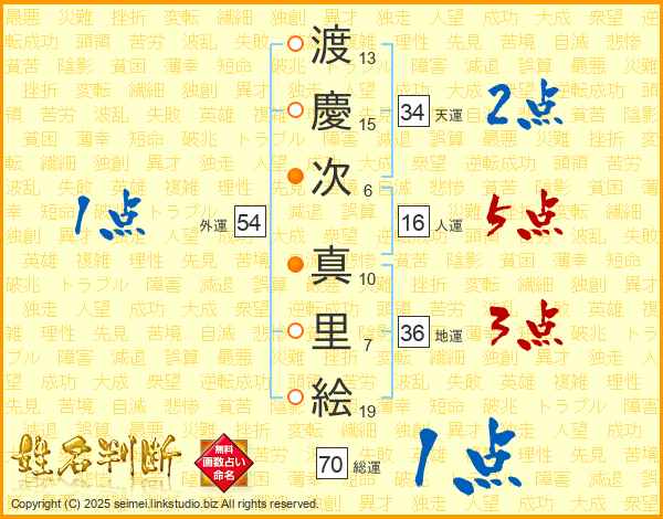 渡(13画)慶(15画)次(6画) 真(10画)里(7画)絵(19画)
