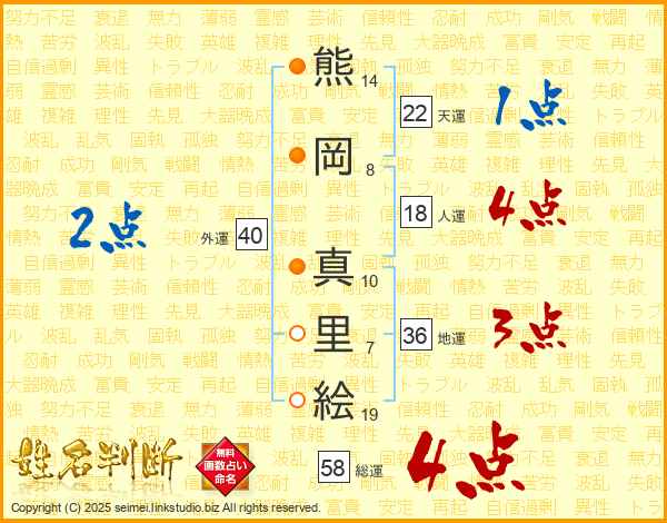 熊(14画)岡(8画) 真(10画)里(7画)絵(19画)