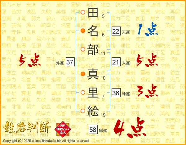 田(5画)名(6画)部(11画) 真(10画)里(7画)絵(19画)