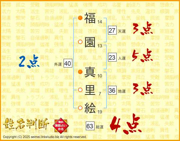 福(14画)園(13画) 真(10画)里(7画)絵(19画)