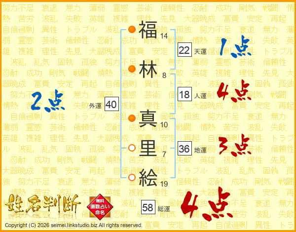 福(14画)林(8画) 真(10画)里(7画)絵(19画)