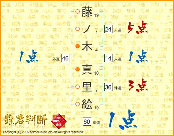 藤(19画)ノ(1画)木(4画) 真(10画)里(7画)絵(19画)