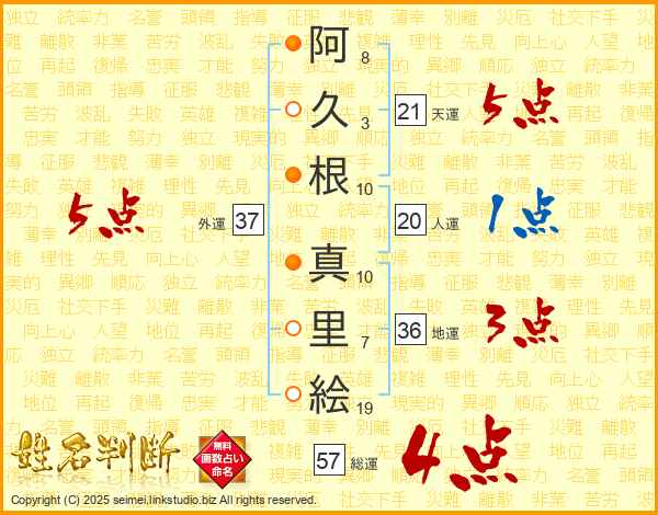 阿(8画)久(3画)根(10画) 真(10画)里(7画)絵(19画)