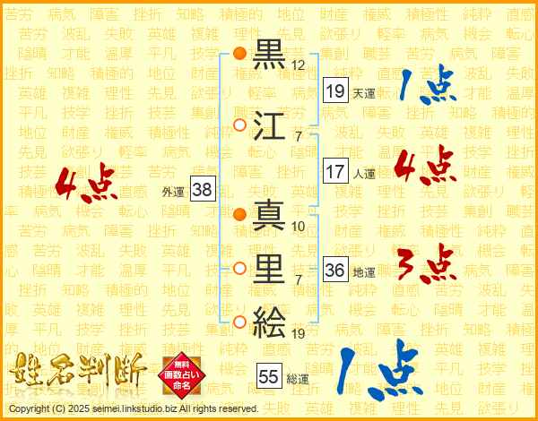 黒(12画)江(7画) 真(10画)里(7画)絵(19画)