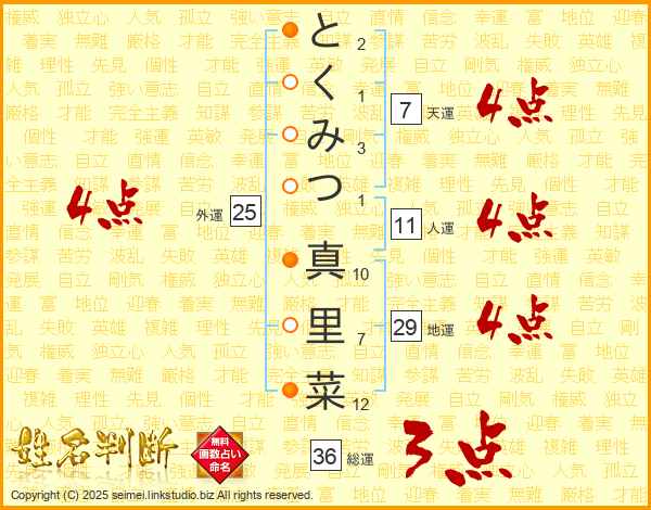 と(2画)く(1画)み(3画)つ(1画) 真(10画)里(7画)菜(12画)