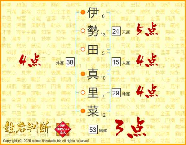 伊(6画)勢(13画)田(5画) 真(10画)里(7画)菜(12画)