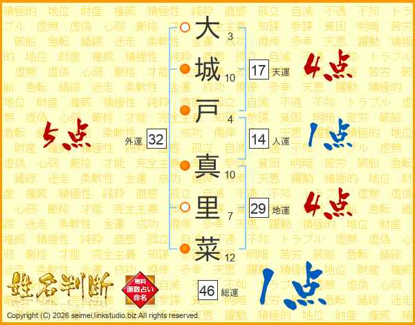 大(3画)城(10画)戸(4画) 真(10画)里(7画)菜(12画)