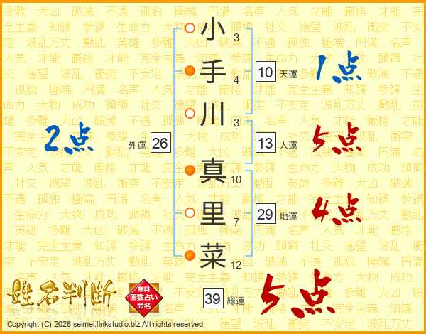 小手川真里菜さんの総運は39画の5点!