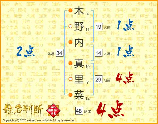 木野内真里菜さんの外運は34画の2点!