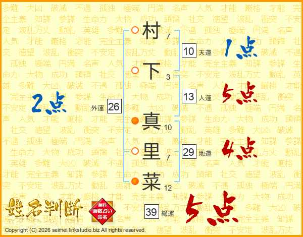 村(7画)下(3画) 真(10画)里(7画)菜(12画)