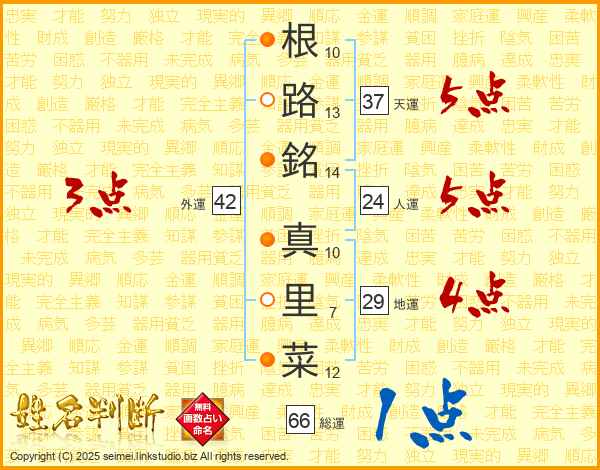 根(10画)路(13画)銘(14画) 真(10画)里(7画)菜(12画)
