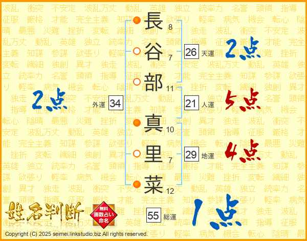 長(8画)谷(7画)部(11画) 真(10画)里(7画)菜(12画)