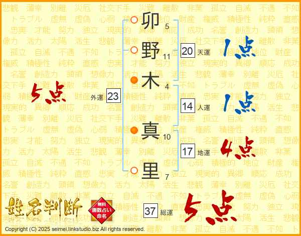 卯(5画)野(11画)木(4画) 真(10画)里(7画)