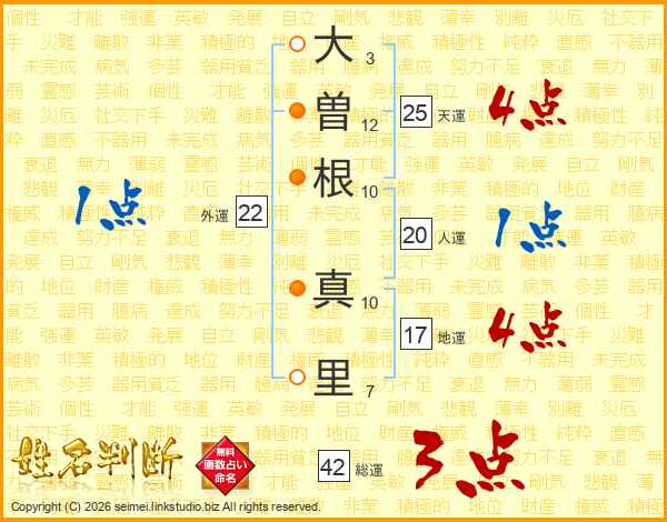 大(3画)曽(12画)根(10画) 真(10画)里(7画)