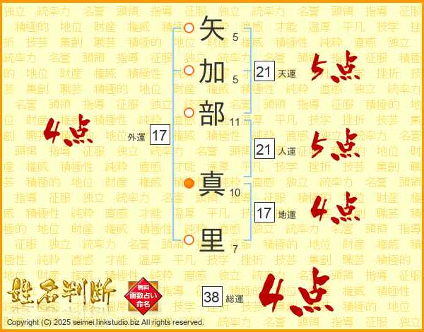 矢(5画)加(5画)部(11画) 真(10画)里(7画)
