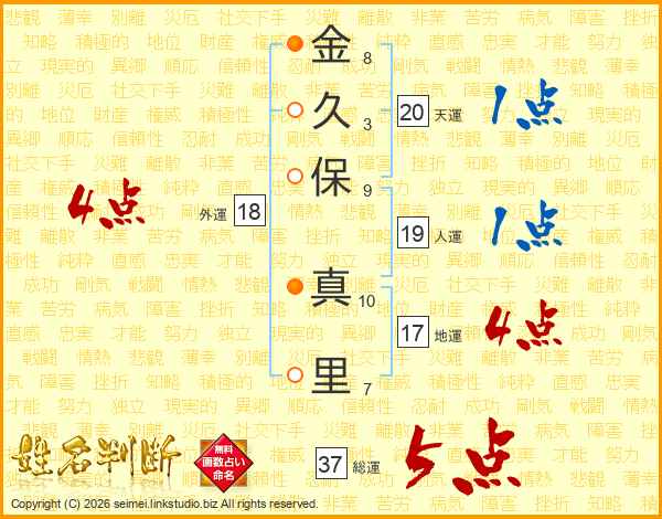 金(8画)久(3画)保(9画) 真(10画)里(7画)