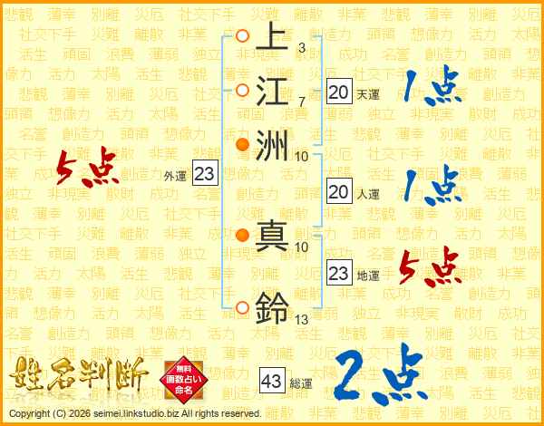 上(3画)江(7画)洲(10画) 真(10画)鈴(13画)
