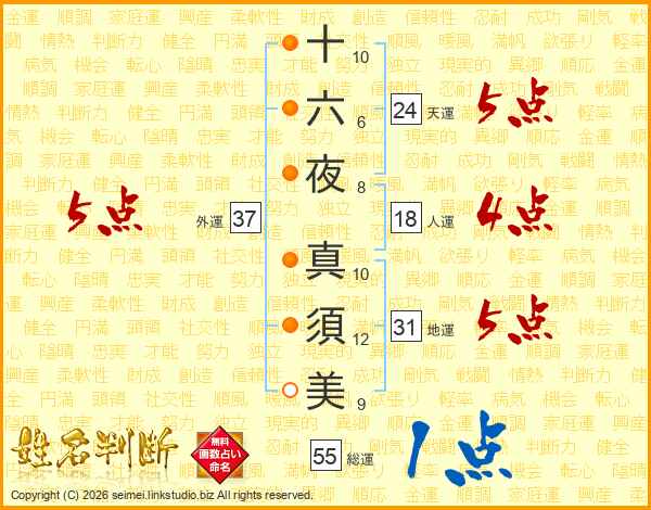 十(10画)六(6画)夜(8画) 真(10画)須(12画)美(9画)