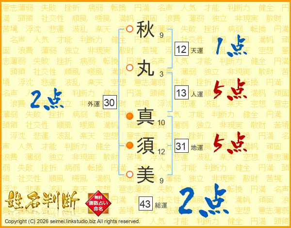 秋(9画)丸(3画) 真(10画)須(12画)美(9画)