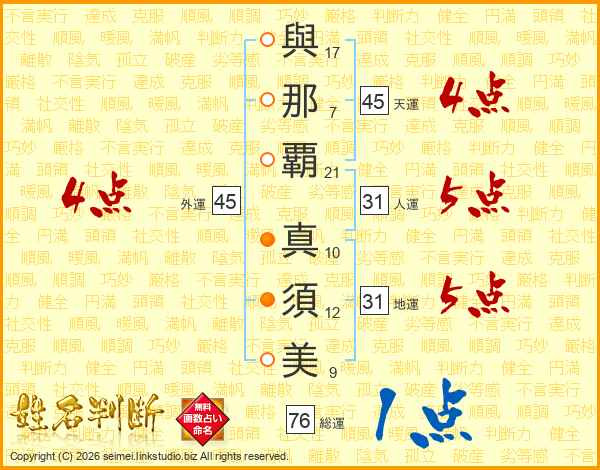 與(17画)那(7画)覇(21画) 真(10画)須(12画)美(9画)