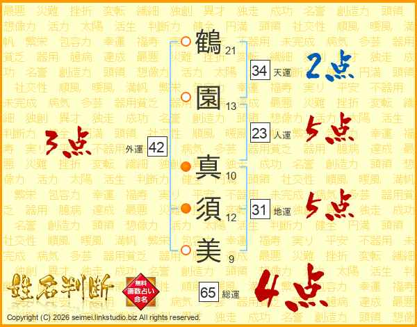 鶴(21画)園(13画) 真(10画)須(12画)美(9画)