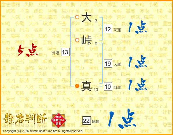 あなたの人生を表す1番重要な運勢です。生涯を通じて影響する総合運となり、主に50歳以降の晩年期に影響を及ぼします。苗字と名前の合計画数。