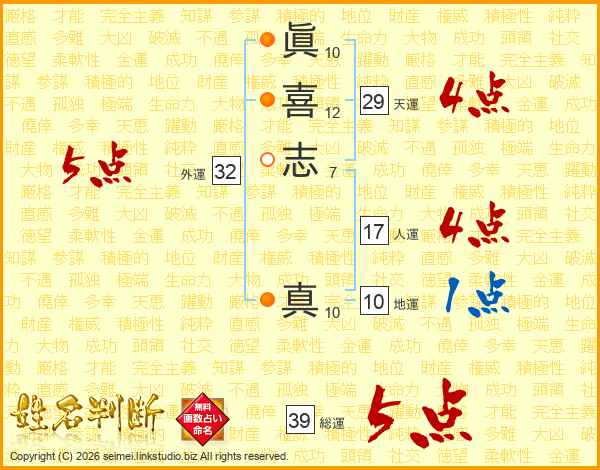 あなたの人生を表す1番重要な運勢です。生涯を通じて影響する総合運となり、主に50歳以降の晩年期に影響を及ぼします。苗字と名前の合計画数。