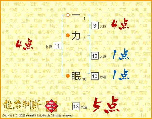 あなたの人生を表す1番重要な運勢です。生涯を通じて影響する総合運となり、主に50歳以降の晩年期に影響を及ぼします。苗字と名前の合計画数。