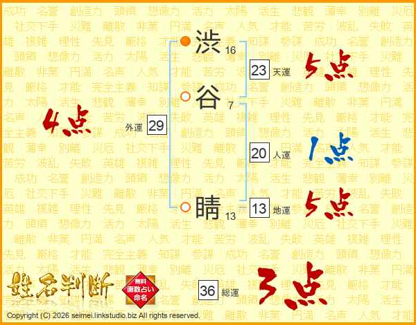 あなたの人生を表す1番重要な運勢です。生涯を通じて影響する総合運となり、主に50歳以降の晩年期に影響を及ぼします。苗字と名前の合計画数。