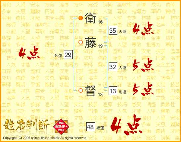 あなたの人生を表す1番重要な運勢です。生涯を通じて影響する総合運となり、主に50歳以降の晩年期に影響を及ぼします。苗字と名前の合計画数。
