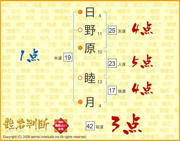 日(4画)野(11画)原(10画) 睦(13画)月(4画)