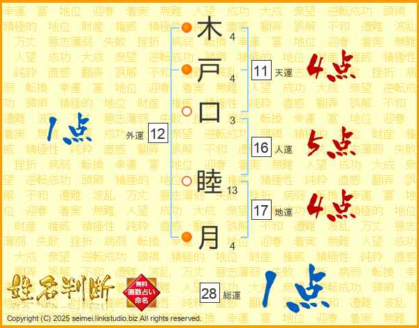 木(4画)戸(4画)口(3画) 睦(13画)月(4画)