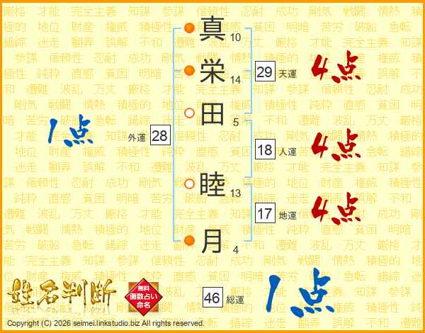 真(10画)栄(14画)田(5画) 睦(13画)月(4画)