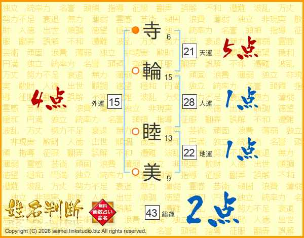 寺(6画)輪(15画) 睦(13画)美(9画)