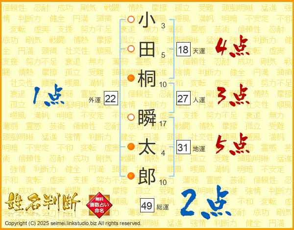 小(3画)田(5画)桐(10画) 瞬(17画)太(4画)郎(10画)