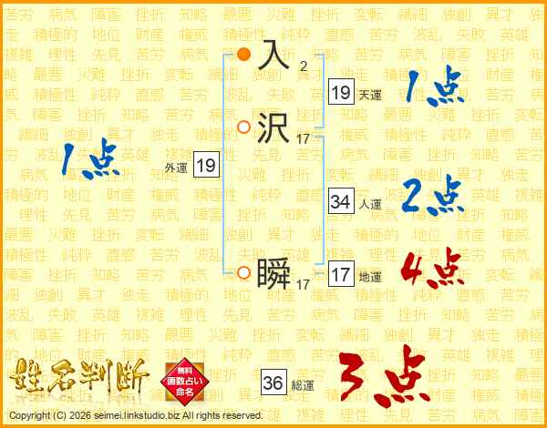 入(2画)沢(17画) 瞬(17画)