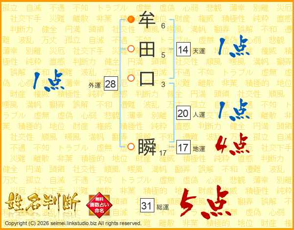 牟田口瞬さんの総運は31画の5点!