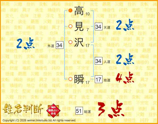 高見沢瞬さんの総運は51画の3点!
