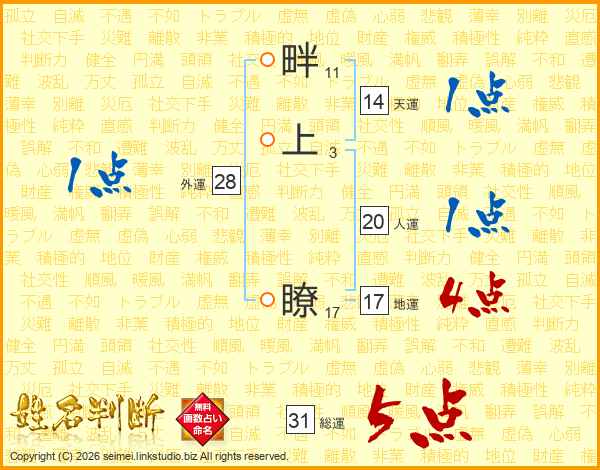 生活面を象徴する運勢です。外部から受ける影響力を表し、結婚運、家庭運や職場、環境への順応性を表します。総運から人運を引いた画数。姓や名が1文字の場合を除く。