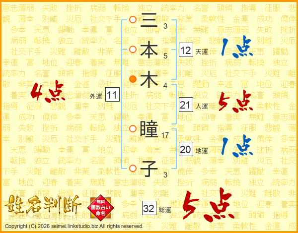 三(3画)本(5画)木(4画) 瞳(17画)子(3画)