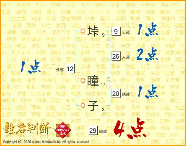 生活面を象徴する運勢です。外部から受ける影響力を表し、結婚運、家庭運や職場、環境への順応性を表します。総運から人運を引いた画数。姓や名が1文字の場合を除く。