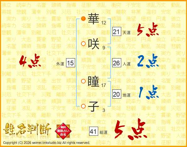 華咲瞳子さんの総運は41画の5点!